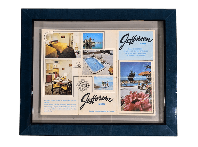 This is an original pamphlet from the historical Jefferson Hotel in Treasure Island and would make a bright accent in any home. Framed in a beautiful turquoise accented floating frame, so both sides of the pamphlet may be viewed without removing from the frame.